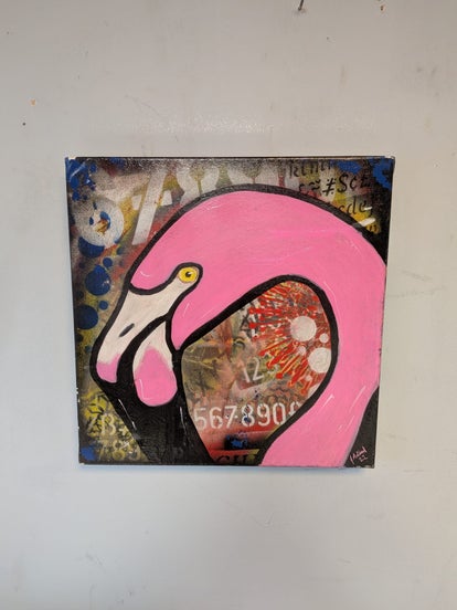 Flamingo head with a graffiti background hand painted in acrylic on canvas.