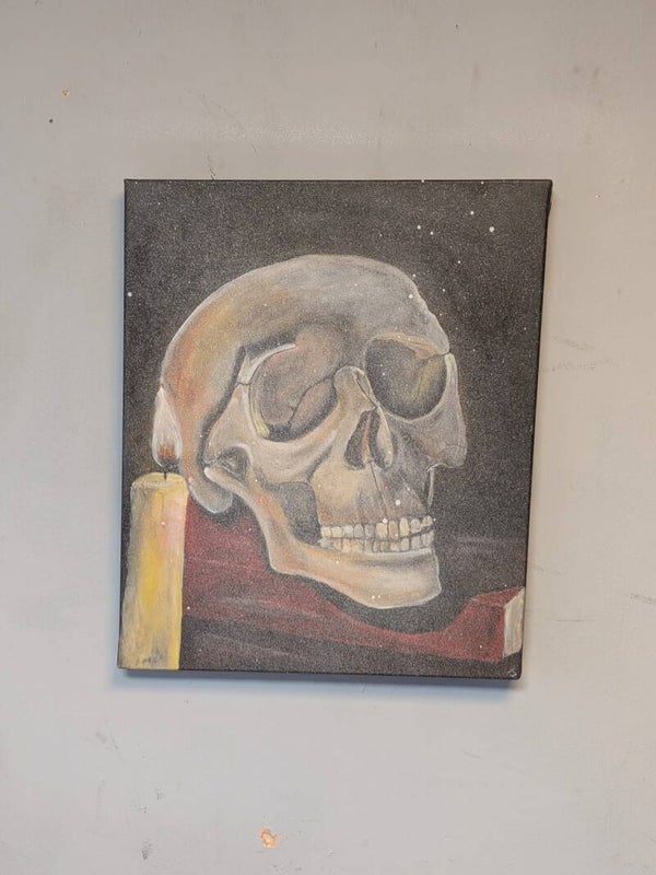 Skull on a Book with Candle. Hand painted in acrylic on a canvas.
