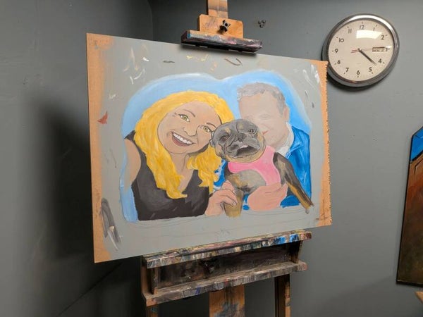 Couple with pug, done as a unique gift. Hand painted in acrylic and painted on MDF wood cut out to the shape of painting.